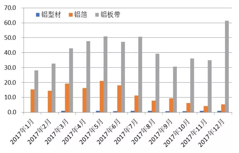 这个是我们统计的整个2012年到2017年的一个铝材的产量对比,每年的4月份、5月份、6月份是一个旺季,从春节淡季过后的一个消费恢复的过程,到6月份是一个每年的一个最高值,7月份是夏季的一个高温淡季,但是从8月份以后到年底基本上是这个产量是一个增长的趋势。